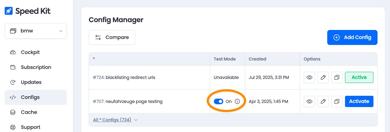 Speed Kit allows you to safely test a new or updated configuration on the live site without activating it for all users.
