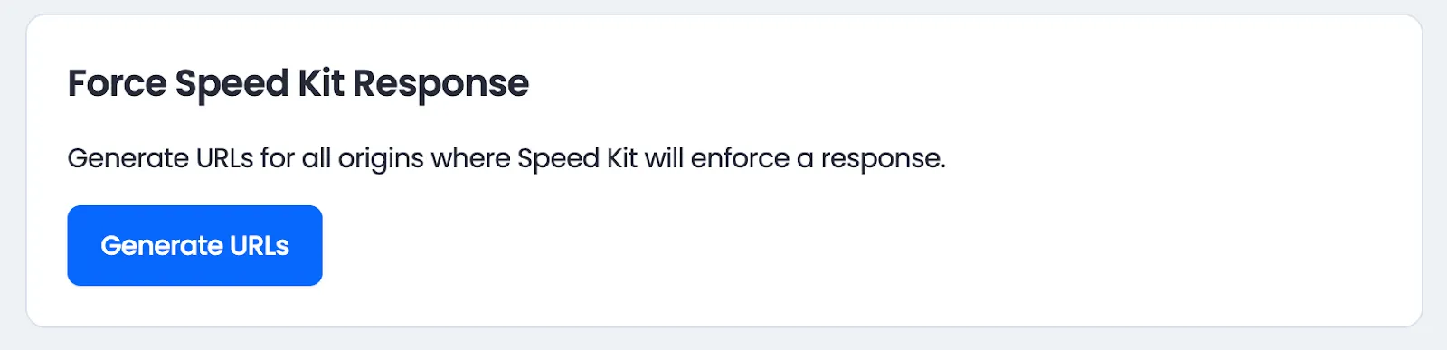- Force Speed Kit Response: This feature generates special links that force a response from Speed Kit's infrastructure. By clicking the button, you create links for your origins that can be used to test the active Speed Kit configuration in any browser or on any device. This is ideal for quick validation on mobile devices or in browsers where the extension is not available.