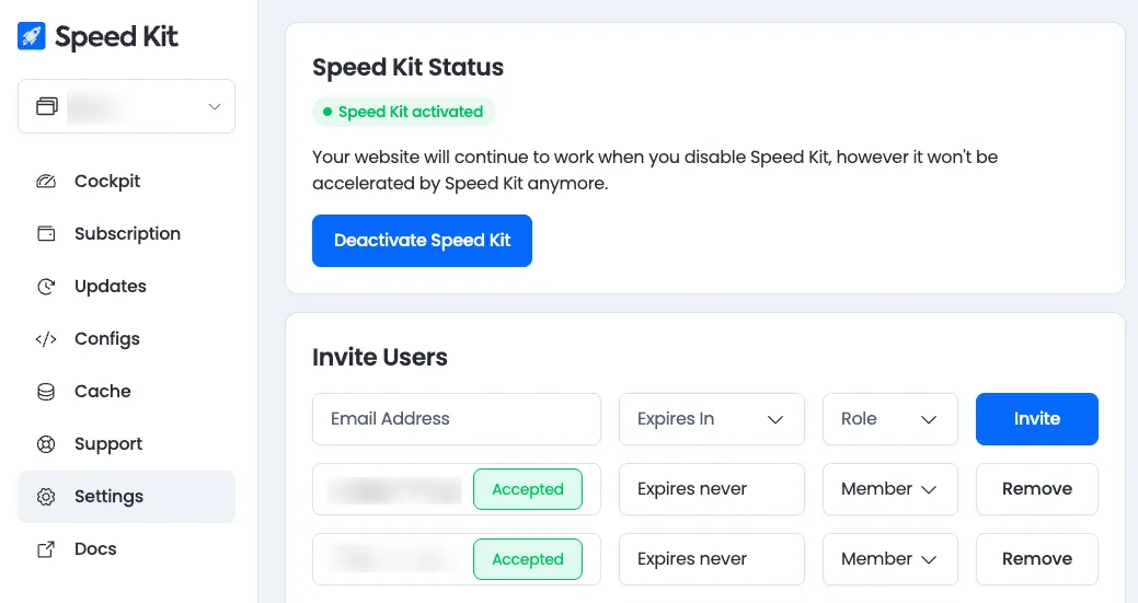 - Global Activation Switch: This is the master switch for the service. You can globally activate or deactivate Speed Kit for all users with a single click. This acts as a primary kill switch to revert all traffic to the origin if a critical issue is suspected, with the change taking effect globally within a few seconds.