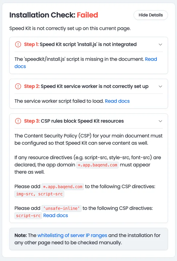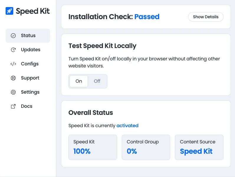 - Installation Check: Instantly verifies if Speed Kit is installed correctly. If any issues are found, it provides clear error messages and a step-by-step guide to resolve them.