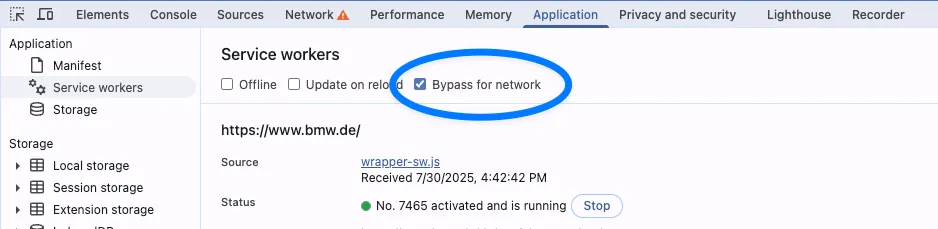 Navigate to the "Application" tab and select "Service Workers". Checking the "Bypass for network" box will instantly disable Speed Kit for that tab. Unchecking it will re-enable it. This method is the quickest way to switch between the Speed Kit and origin experiences, as it doesn't require the service worker to be fully reinstalled or uninstalled.