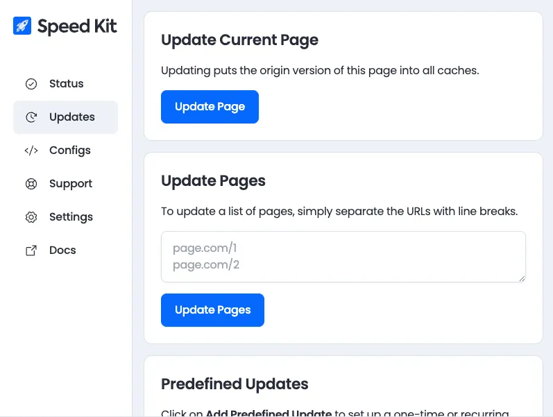 Manually trigger a content refresh for the current page you are viewing. Note: This action requires you to be logged into the Speed Kit Dashboard.