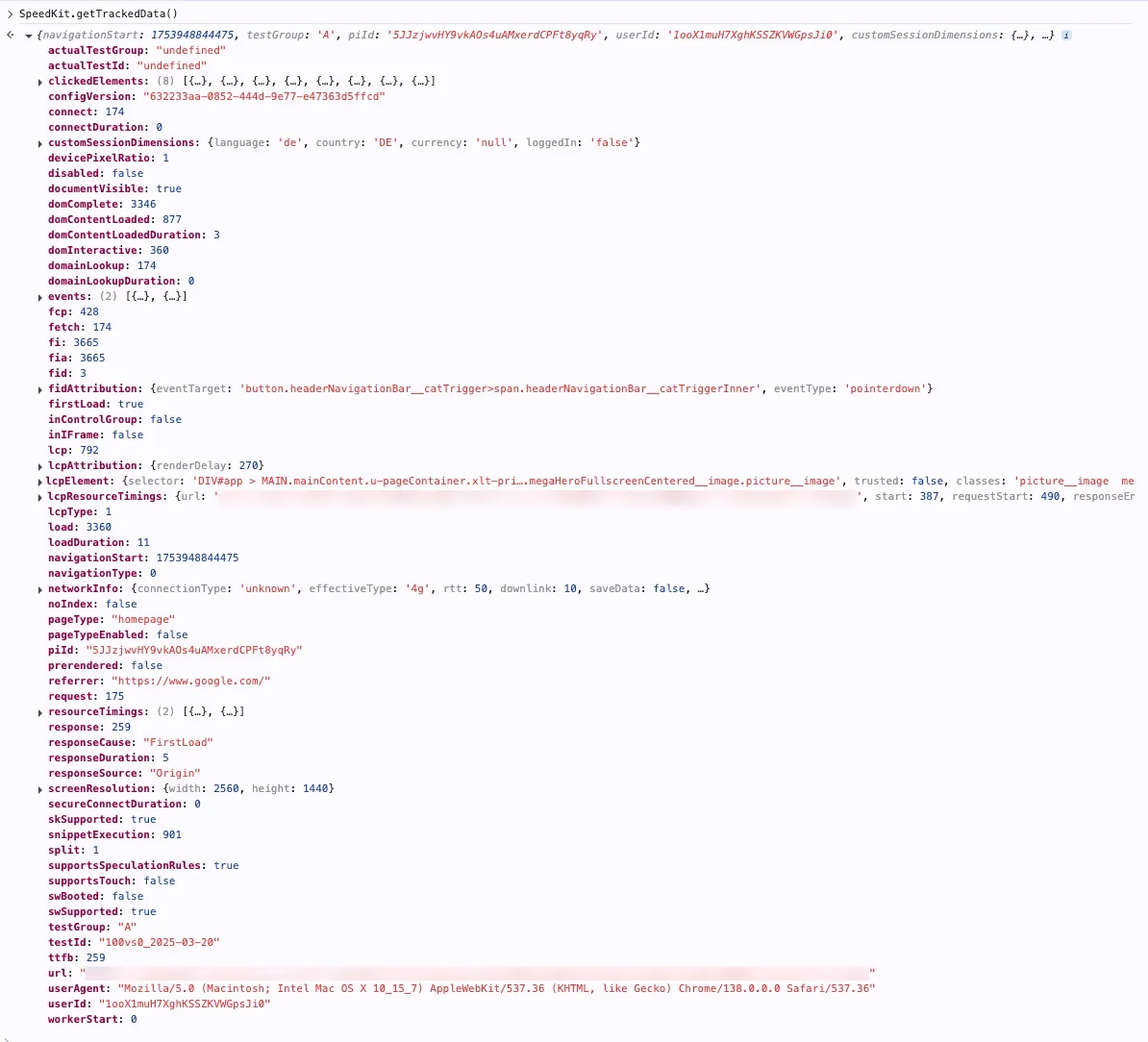 : Shows all data collected by the Speed Kit RUM tool for the current session.