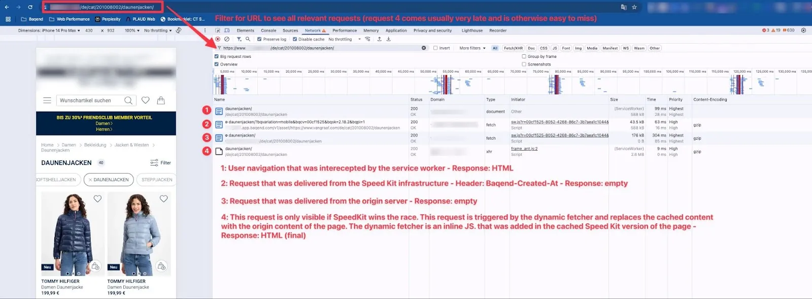 header, it confirms that Speed Kit won. - Speed Kit Infrastructure Request (optional): This request to the Speed Kit infrastructure only appears if the content cannot be served from a local cache (prerendered or service worker). It is used to fetch the anonymized, cached version of the page from the network (e.g., an edge node).
