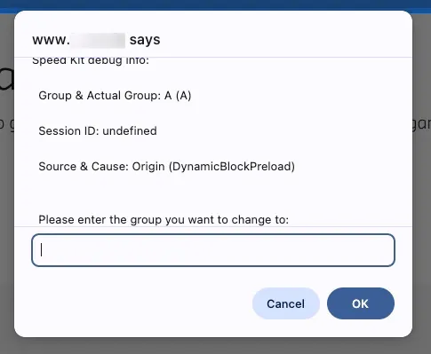 . This is particularly useful for quickly checking Speed Kit's behavior on mobile devices. - To change the A/B test group, you can then enter a new value: