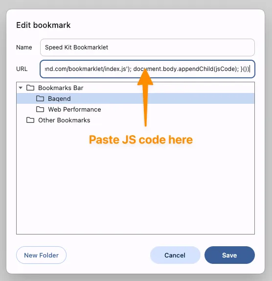 4. Edit the bookmark and paste the copied code into the URL or address field.
