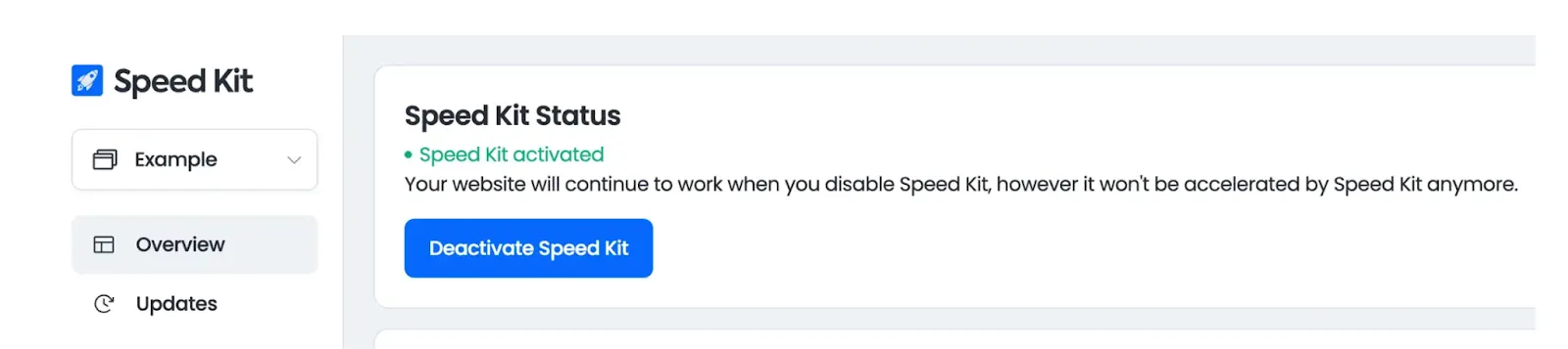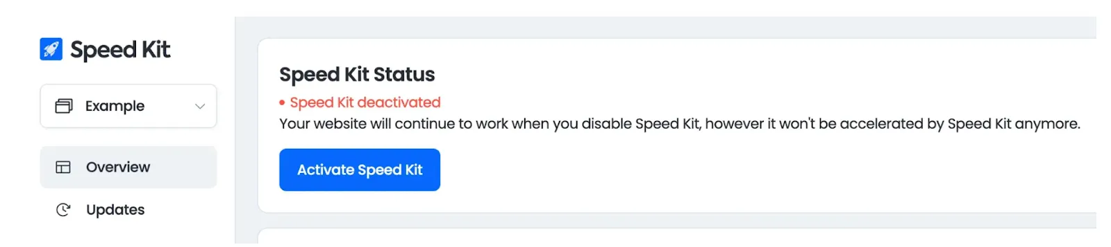 If the problem persists after deactivation, Speed Kit was not the cause. In this case, or if you deactivated Speed Kit by mistake, you can re-enable it by clicking the Activate Speed Kit button in the same section.