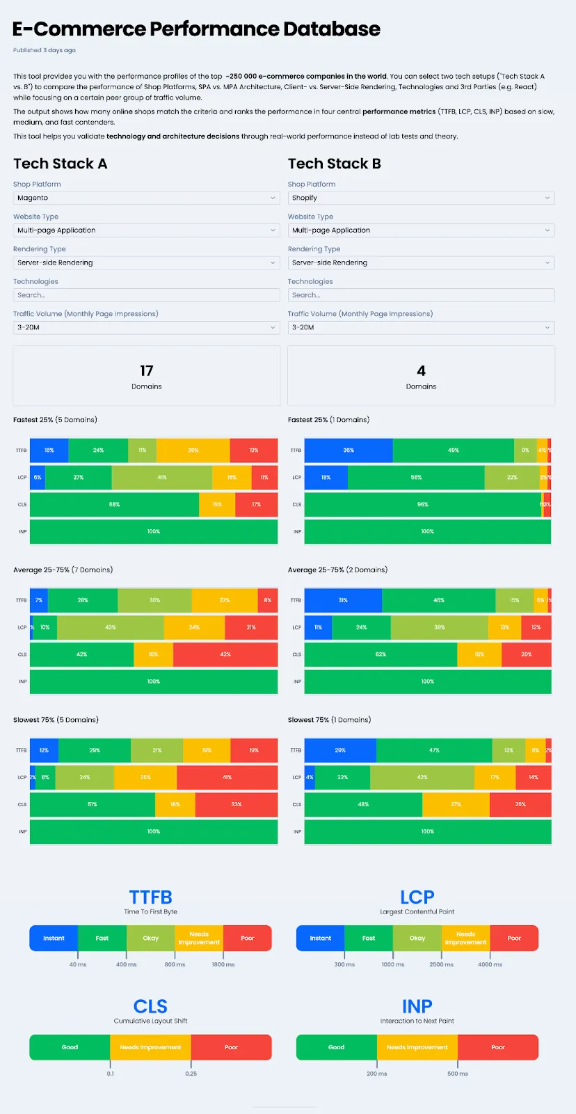- Leverage Our Data: To help you make a data-driven decision, we provide access to the industry's largest performance database. This unique resource contains data from ~250,000 online shops, allowing you to effectively compare different shop platforms, technologies, and third-party integrations.