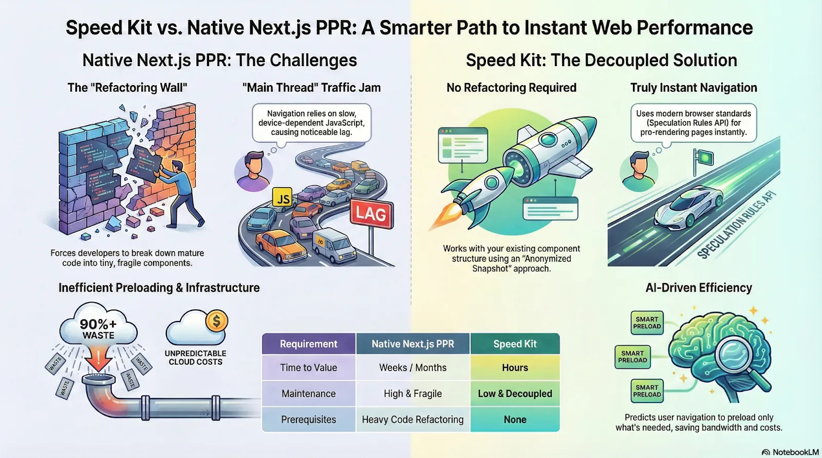 - Decoupled Architecture: Speed Kit delivers instant loading speeds through a browser-based Service Worker and Edge logic, eliminating the need to refactor complex code or "atomize" components as required by Native PPR.